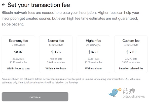 根据您愿意等待 NFT 铸造的时间来选择交易费率,请留意为各种费率选择提供的估计铸造时间。