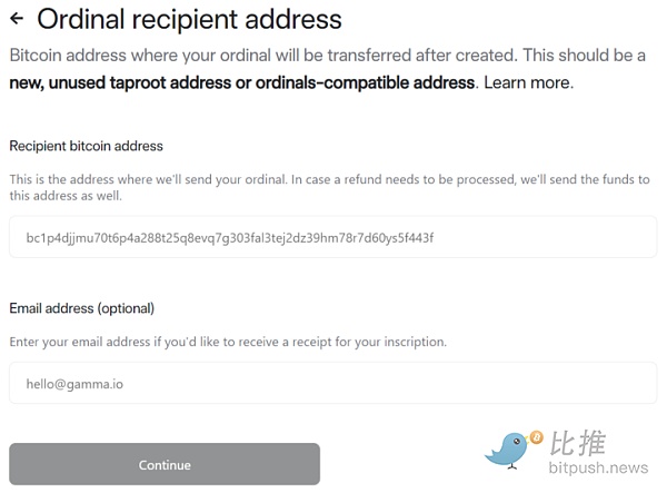 这是该过程中棘手的部分之一。下一步是指定应将 Ordinal NFT 发送到的比特币地址。该地址需要是Taproot 地址或Ordinal兼容地址。
