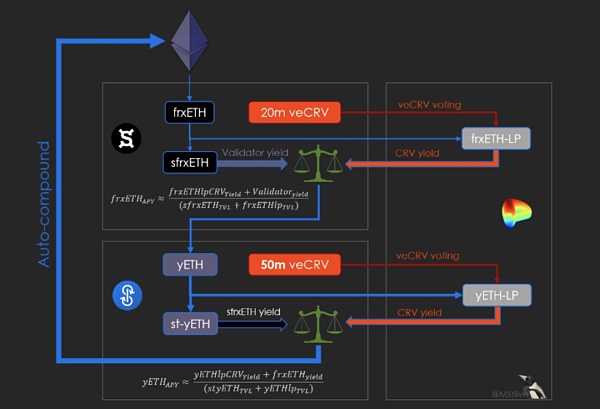 不过后续的回报可能也是丰厚的,例如FXS本身稳定币的玩法,在吸纳大量ETH铸造frxETH后有可能开发出lsdETH-USD稳定币的玩法,叠加一层资产创造,后续会是各个DeFi协议瞄准的重点,由初期单纯堆lsd-TVL锁仓量逐渐过渡到APR War和套娃加杠杆的过程。