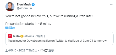 05:21 特斯拉投资者日活动定于北京时间5:00开始,不过和以往的几次特斯拉活动相似,这次活动也没能按时开始。不过,特斯拉CEO马斯克在推特上表示:活动将在5分钟内开始 。
