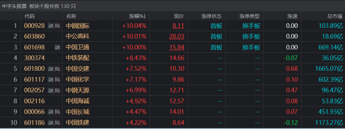 目前,中字头板块频获政策端利好。据悉,国资委近日召开**企业提高上市公司质量工作专题会,会议指出,下一步,要针对工作中的突出问题和薄弱环节,科学谋划、周密组织,统筹推进**企业高质量上市,通过充分对接资本市场、助力稳定资本市场,为**企业高质量发展提供坚实支撑、为建设中国特色现代资本市场贡献更大力量。受消息提振,中字头板块近期连日走高。