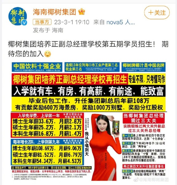 3月1日,海南椰树集团官博发布一则“招生广告”,内容为“椰树集团培养正副总经理学校第五期学员招生。”招生启事显示,上学第一年,博士生年薪33.6万,月薪2.8万;硕士生年薪25.2万,月薪2.1万;本科生年薪16.8万,月薪1.4万。