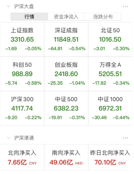 沪指今日窄幅震荡,创业板指低开低走,午后跌幅扩大至1%。截止收盘沪指跌0.05%,深成指跌0.54%,创业板指跌1.04%。共1710只个股上涨,3183只个股下跌。北向资金净买入超7亿元。