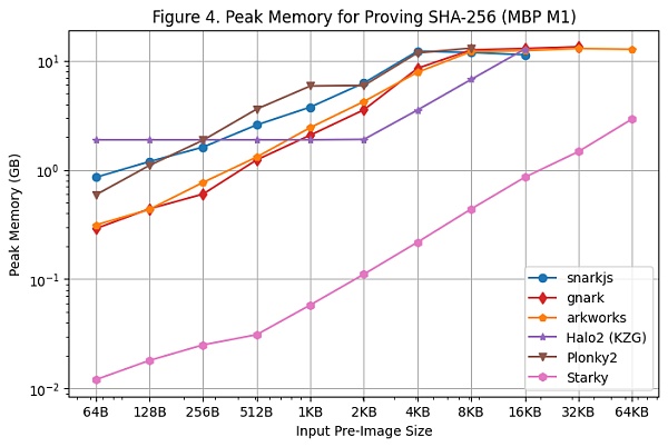 除了 Starky 之外,所有 SNARK 框架在原像尺寸变大时都会遇到内存不足 (OOM) 错误或使用交换内存(导致证明时间变慢)现象。具体来说,Groth16 框架(snarkjs、gnark、Arkworks)在原像尺寸>= 8KB 时就开始使用交换内存,而 gnark 在原像尺寸>= 64KB 时出现内存不足。当原像尺寸>= 32KB 时,Halo2 遇到了内存限制。当原像尺寸>= 8KB 时,Plonky2 开始使用交换内存。