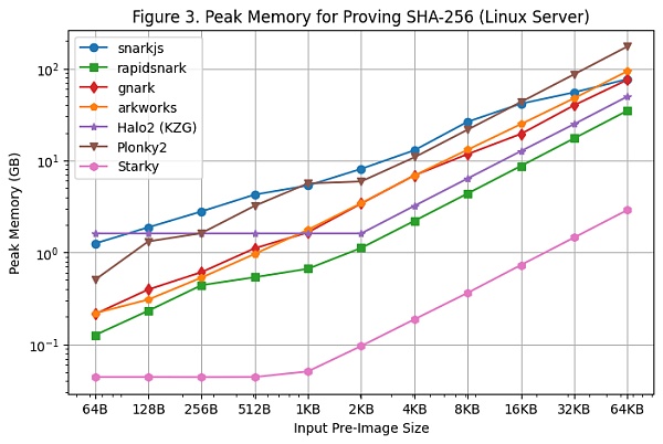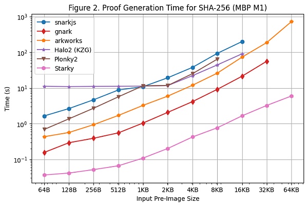 [图 1] 使用 Linux 服务器测试了 SHA-256 的每个框架在各种原图像尺寸上的证明生成时间。我们可以得到以下发现: