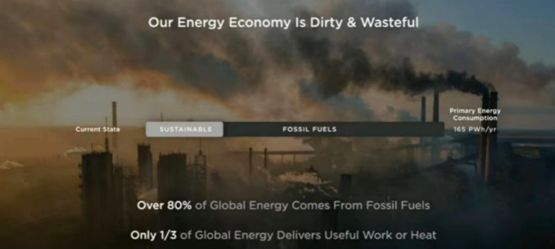为什么要“改造地球”?按马斯克的说法:“我们的能源经济是肮脏和浪费的。”他表示,目前全球超过80%的能源来自化石燃料,全球只有1/3的能源能提供有用的功或热。