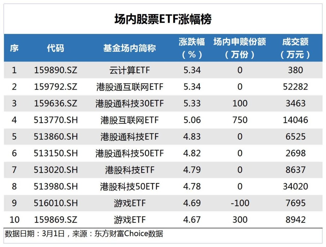 数据显示,昨日场内股票型ETF中,云计算ETF、港股通互联网ETF和港股通科技30ETF涨幅靠前,其中,云计算ETF涨幅5.34%,排名第一。