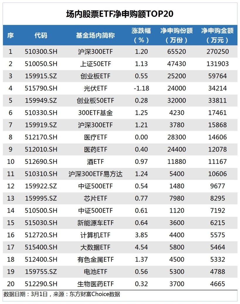 昨日,净申购金额最多的为沪深300ETF,净申购金额27.03亿元。此外,上证50ETF和创业板ETF也获申购居前,净申购金额依次为13.19亿元和5.98亿元。