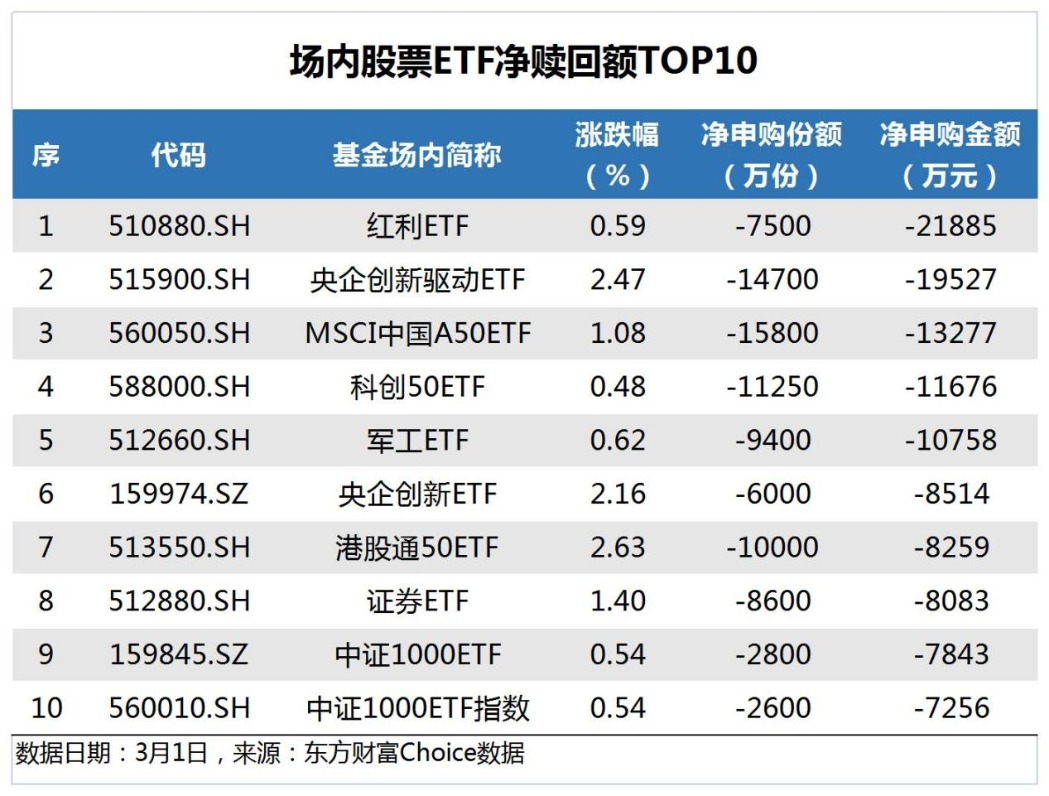 数据还显示,昨日净赎回金额最多的场内股票ETF为红利ETF,赎回金额2.19亿元,央企创新驱动ETF紧随其后,赎回金额1.95亿元。
