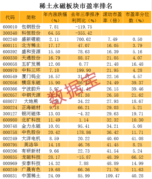 业绩方面来看,稀土永磁板块合计有12只个股预增。另外从去年三季报业绩来看,净利同比增长的公司多达20家,下降的公司只有5家。具体而言,盛新锂能、中科三环、中色股份等个股去年三季报净利同比翻倍增长。估值角度来看,盛新锂能滚动市盈率低于8倍,北方稀土、盛和资源两只个股市盈率均不足20倍。众多个股估值处于近10年来低位。比如龙头北方稀土市盈率处于近10年来分位数5%以下。