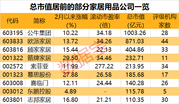 市场表现方面,这些家居用品公司2月以来平均涨幅为8.12%,大幅跑赢大盘。好太太、箭牌家居、金牌厨柜等5股涨幅均超过25%;其中好太太涨幅32.73%居首,公司主要产品包括吸油烟机、燃气灶具、消毒柜、燃气热水器和电热水器等多个品类数百型号的厨卫电器。