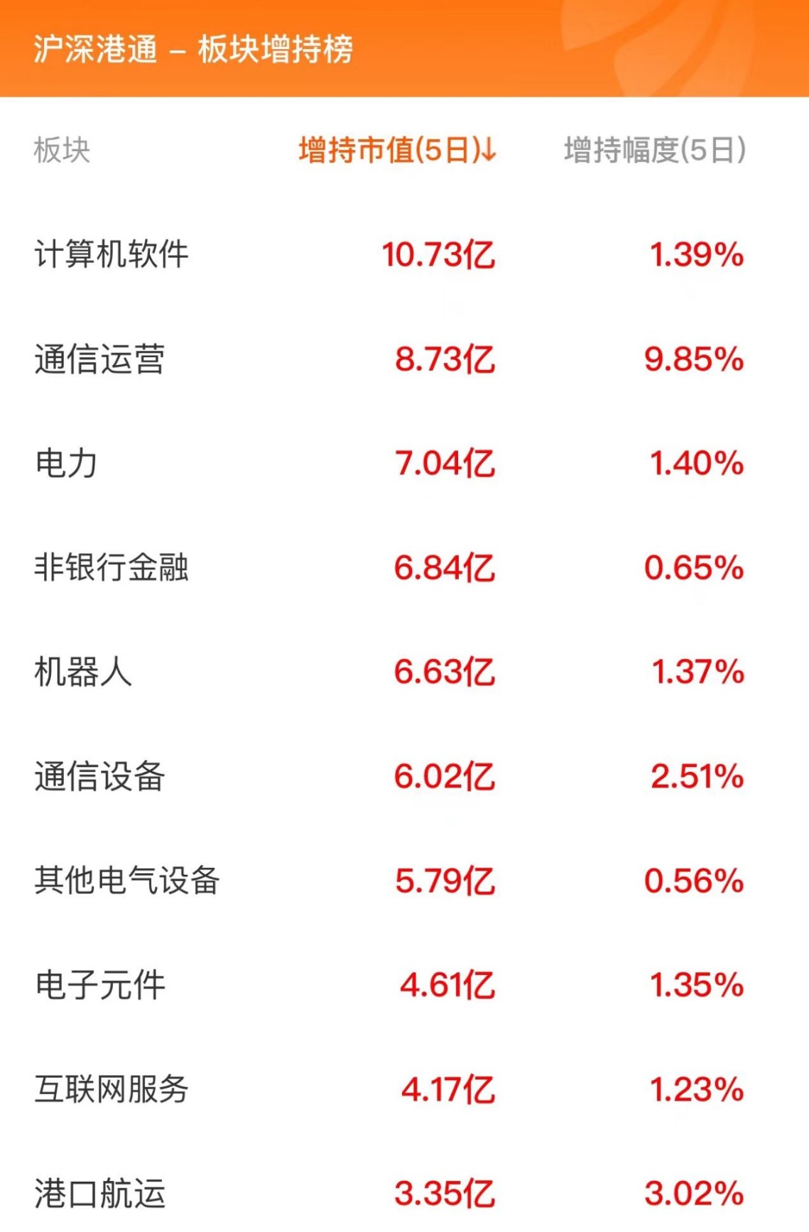 数据显示,近五个交易日,北向资金增持计算机软件板块10.73亿元,增持通信运营板块8.73亿元,增持电力板块7.04亿元,此外,营销服务板块增持幅度最大,达20.9%。