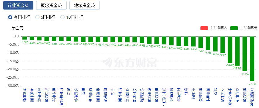 净流出方面,互联网服务、通信设备等净流出排名靠前,其中互联网服务净流出27.1亿元。