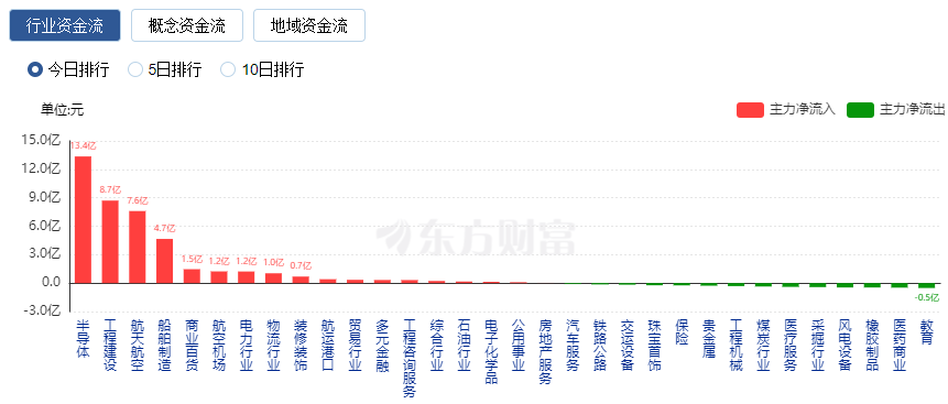 行业资金方面,截至午间收盘,半导体、工程建设等净流入排名靠前,其中半导体净流入超13.4亿元。