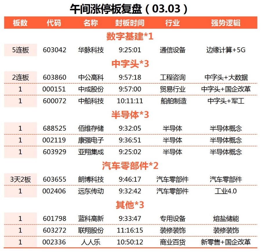 个股方面,今日中字头个股集体走强,中铁装配涨超16%,中公高科、中成股份涨停,中国交建、中国电信、中国联通、中国移动等跟涨;军工股走强,中船科技涨停,中国卫通、中天火箭涨超5%;半导体板块开盘拉升,佰维存储20CM涨停,通富微电、安集科技涨超8%;数字经济概念分化调整,华脉科技4晋5板,浪潮信息一字跌停,海天瑞声跌超10%,汉王科技跌停。