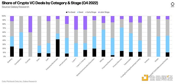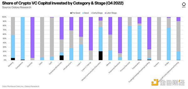 当我们按照行业类别和发展阶段来划分投资交易时可以发现,投资大多投向了处于早期发展阶段的 Web3 公司。在 Web3、钱包、隐私/安全、合规和挖矿类别的投资中,有超过 50% 的交易都是发生在处于种子轮和种子前,在交易和数据类别的投资,有 60% 都发生在 A 轮及之后。