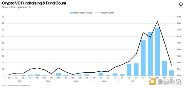 在当前的宏观环境下,因为投资者对投资风险的重新考量或是直接撤资,导致投资机构筹集资金变得很困难,特别是伴随着加密资产价格的下跌和市场的大动荡,进一步加剧了这种困难,2022年Q4季度,无论是加密 VC 基金的数量还是加密基金筹款总额都创下了近两年来的新低。