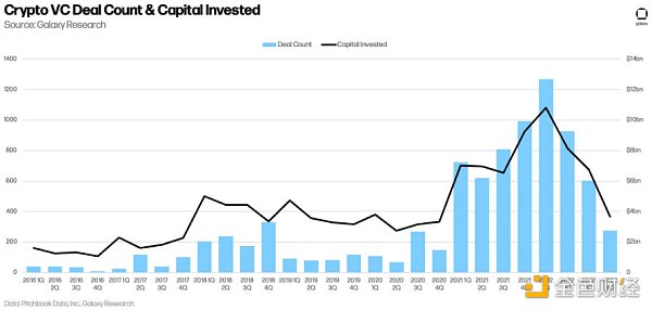 2022 年第一季度,加密 VC 行业创下了 130 亿美元投资金额和 1100 笔交易的历史新高,之后伴随着美元利率的上升、宏观经济环境的恶化以及资本市场的动荡,投资者对加密货币领域的投资兴趣大幅减少,Crypto VC 交易数量和投资金额也开始持续下滑,加密 VC 市场在2022 年第四季度的表现甚至不足2018的同期水平。
