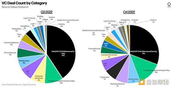 2022 年Q4,发生在 Web3/NFT/DAO/Metaverse/Gaming(“Web3”)领域的投资交易占绝大部分,在 2022 年第四季度完成的所有交易中,31% 的投资都投向 Web3 初创公司,而涉及交易、投资和借贷(“交易Trading”)等领域的投资占比大约 13%,位居第二。