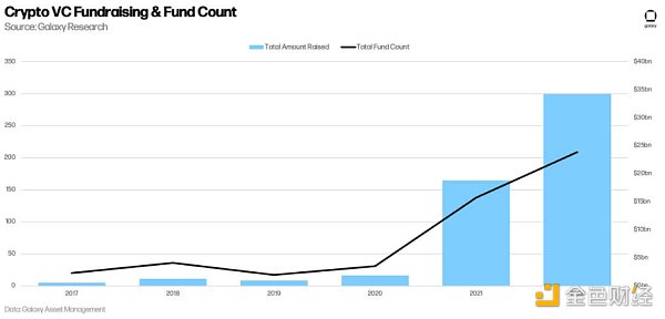 纵观整个VC市场,2022年市场募集超过200只基金,平均每支基金规模超过1.6亿美元。2022 年上半年活跃的 VC 筹款市场是由2021年的加密叙事来推动的,几只突出的大型基金筹款推高了最终的总额,例如 a16z、Hivemind、Ribbit Capital 和 Haun Ventures 等在2022年都推出了各自规模庞大的投资基金。