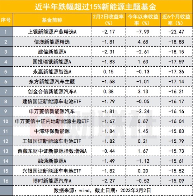 数据显示,当前全市场不同份额合并计算的新能源基金共计75只,从近半年收益率来看,截至3月2日,上述全部基金收益率为负,16只基金亏损超过15%,其中去年4月成立的上银新能源产业精选混合收益率最差,近6个月涨幅为-23.47%,相对较好的万家新能源主题同期收益率为-1.03%。