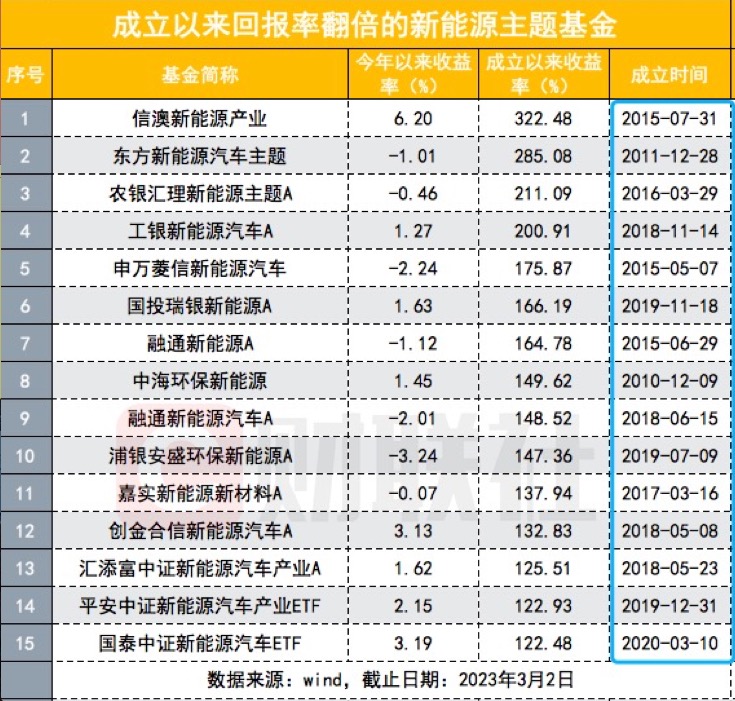 财联社记者统计显示,市场中成立以来回报率翻倍的新能源主题基金共15只,这些翻倍基金成立时间均在2020年之前。