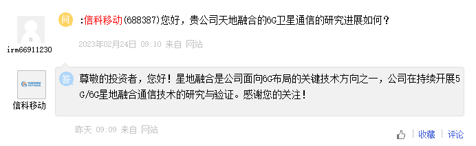 信科移动2日回复投资者提问称,星地融合是公司面向6G布局的关键技术方向之一,公司在持续开展5G/6G星地融合通信技术的研究与验证。