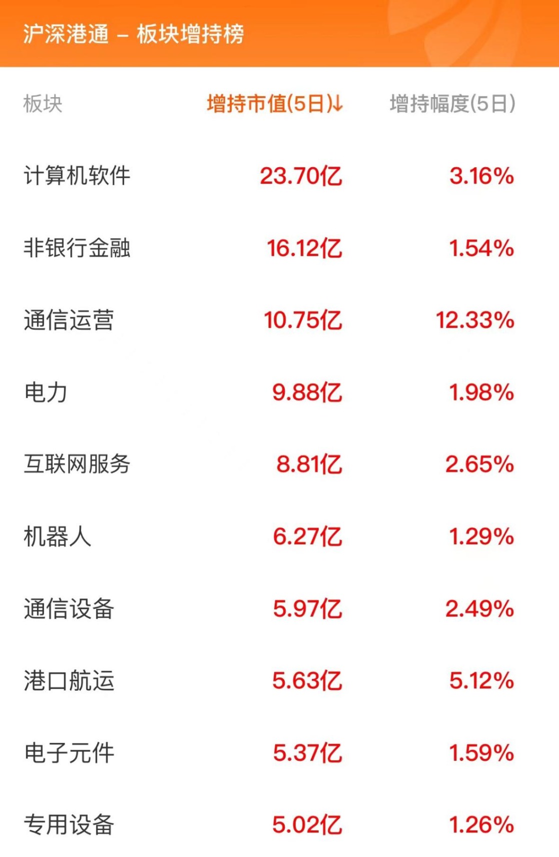 数据显示,近五个交易日,北向资金增持计算机软件板块23.7亿元,增持非银行金融板块16.12亿元,增持通信运营板块10.75亿元,此外,营销服务板块增持幅度最大,达26.81%。