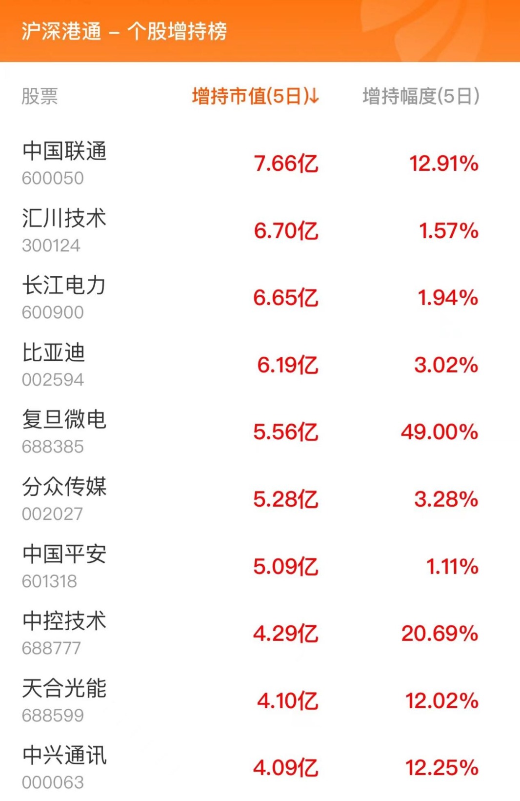 北向资金个股增持榜