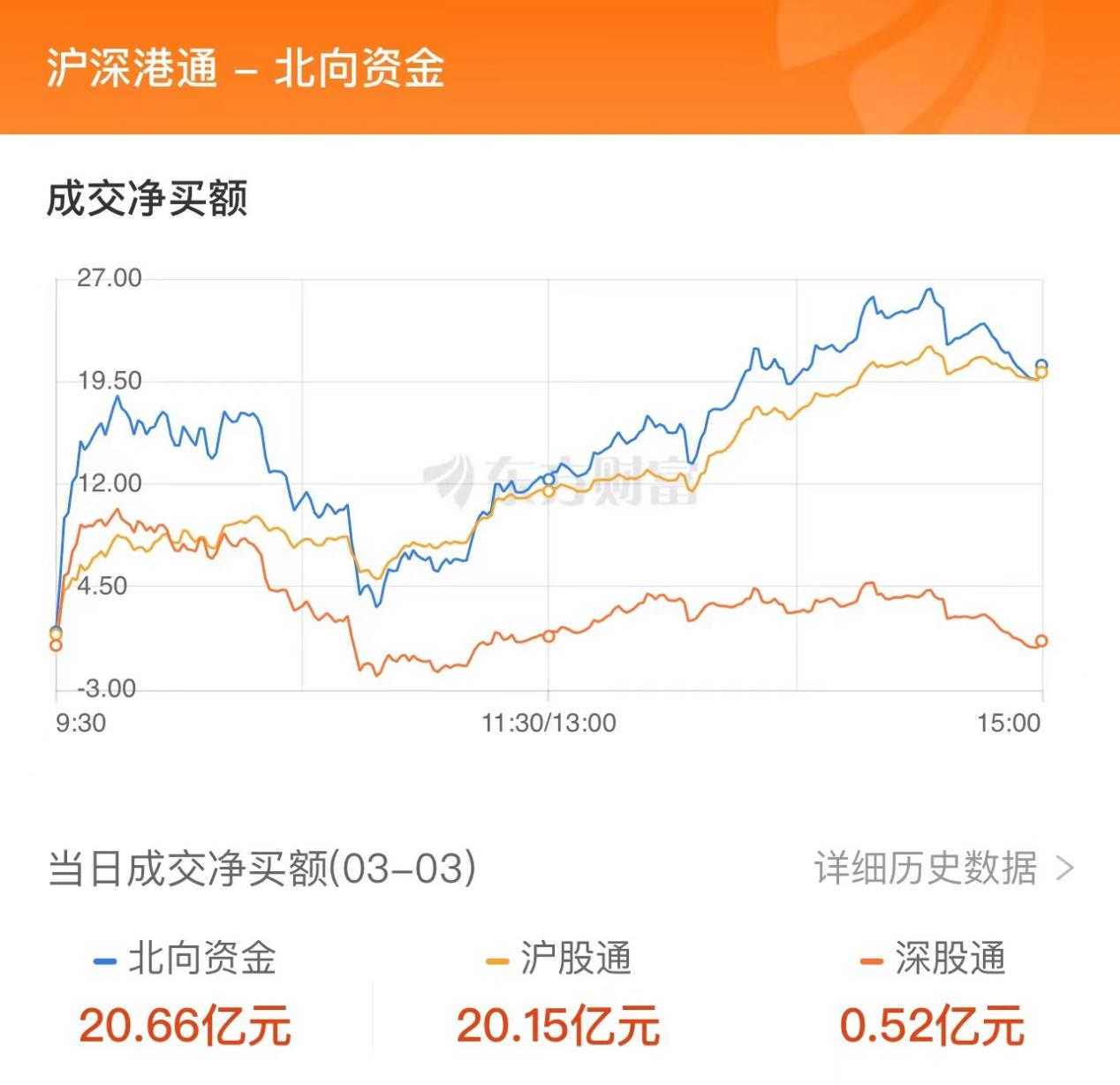3月3日,大盘全天低开后震荡调整,大盘午后震荡走高,三大指数全线翻红,沪指再创反弹新高。北向资金当日净流入20.66亿元,其中,沪股通当日成交净买额20.15亿元;深股通当日成交净买额0.52亿元。昨日北向资金净流入7.65亿元。