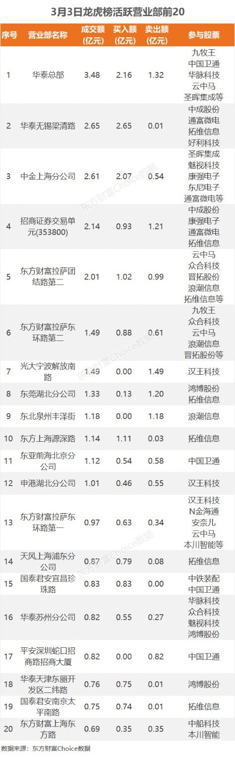 3月3日龙虎榜揭秘:3.5亿抢筹拓维信息