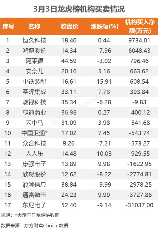 机构参与龙虎榜中个股共涉及17股,其中6股被机构净买入,恒久科技被买入最多,为9734.01万元。另外11股被机构净卖出,东尼电子被卖出最多,为3.1亿元。