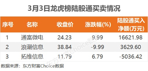 陆股通参与龙虎榜中个股共涉及3股,其中通富微电和浪潮信息被陆股通净买入,金额分别为1.66亿元和3629.6万元。拓维信息被陆股通净卖出5036.42万元。