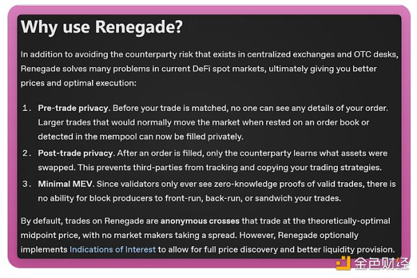 2、Renegade是一种新型的DEX:一个链上暗池。