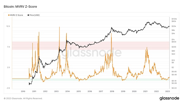 长期趋势指标MVRV-ZScore以市场总成本作为依据,反映市场总体盈利状态。当指标大于6时,是顶部区间;当指标小于2时,是底部区间。MVRV跌破关键水平1,持有者总体上处于亏损状态。当前指标为0.28,脱离了绿色抄底区间。