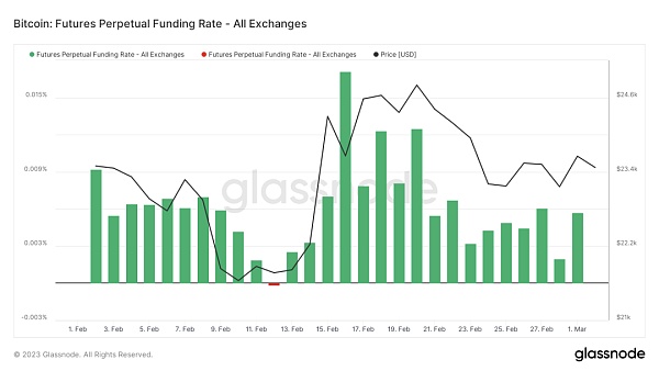 期货资金费率:本周费率为正,表明市场主要看多。费率0.05-0.1%,多头杠杆较多,是市场短期顶部;费率-0.1-0%,空头杠杆较多,是市场短期底部。