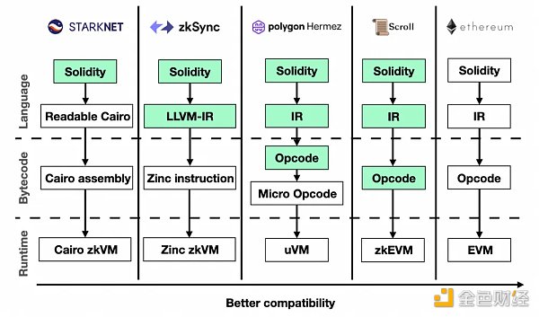 相比之下,ZK 式扩展的特性使得 ZK rollups 从定制的 VM 开始,这意味着项目因此需要更广泛的工作来“解释”来自 EVM 的代码或使用从头开始编写的新代码。不过,截至 2023 年 3 月,多个 ZK rollups 项目现在明显即将公布他们自己的 zkEVM 实现!