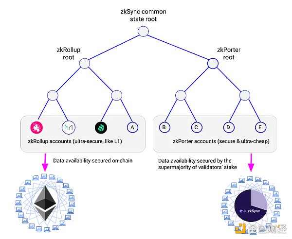 至于 Volitions,它们是 StarkWare 团队创造的一项创新,它们是 ZK-rollup 和 validium 之间的交叉。这就是说,只要有意愿,用户就可以在链上和链下数据可用性之间进行选择。这为应用程序提供了 TPS 性能验证级别的选项,同时仍可与非托管 ZK-rollup 技术互操作。zkSync 的新突破性 zkPorter 机制就是一个值得关注的 volition 系统。