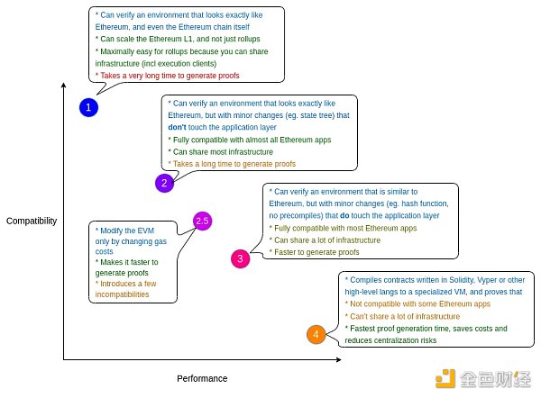 在 2022 年 8 月的一篇博文中,Buterin 提供了一种衡量 zkEVM 项目能力的方法,方法是提出从 Type 1 到 Type 4 的等级来对它们进行分级。Type 1 zkEVM 将与 EVM 完全等效,甚至可以用于升级以太坊本身,而 Type 4 zkEVM 仅与某些以太坊应用程序兼容。