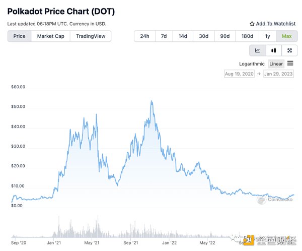 基于「基本面」,Polkadot 被认为是 2021 年牛市高峰期之前最值得投资的代币之一,从 4-6 美元的区间一直运行到高峰时的 55 美元。