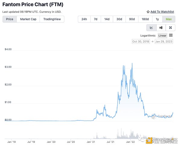 在 2021 年 1 月之前,FTM 代币价格在 0.01-0.02 徘徊,之后涨到了 3.4 美元的顶峰,它是市场周期表现最佳的代币之一,除了 Matic、LUNA、Cardano(ADA)之外。