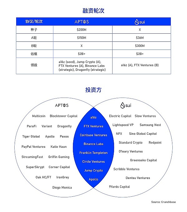 作为Move语言的原生公链,Sui和Move自推出后就捕获了头部资本的关注。A16z参与了两个公链的首轮投资,Sui在21年12月,Aptos在22年3月。目前Aptos估值超过了40亿,SuiB轮融资后估值超过20亿。