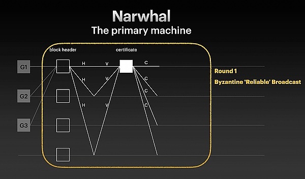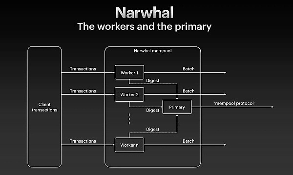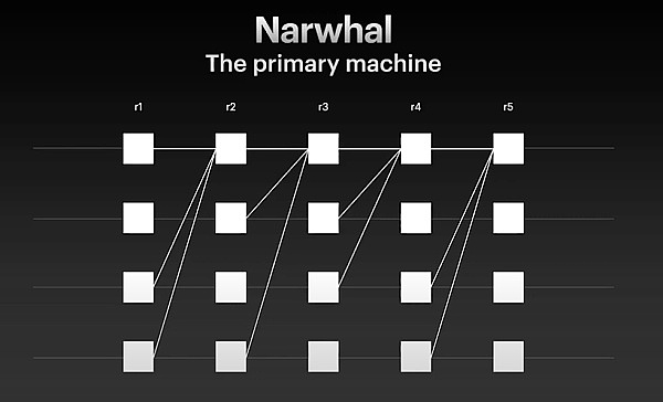 Narwhal的mempool在每个节点内运行,由无数个worker和一个primary组成(可以理解为工人和包工头)。每个worker都会从客户端收到交易,并将所有的交易捆绑一起后广播给其他节点的同序号worker,同时将digest(摘要)发给primary。在这一步,大量的冗余信息都在worker项目之间传递,pimary的工作就是从不同worker中收取各个小单位的digest,成立轮次制的DAG mempool。