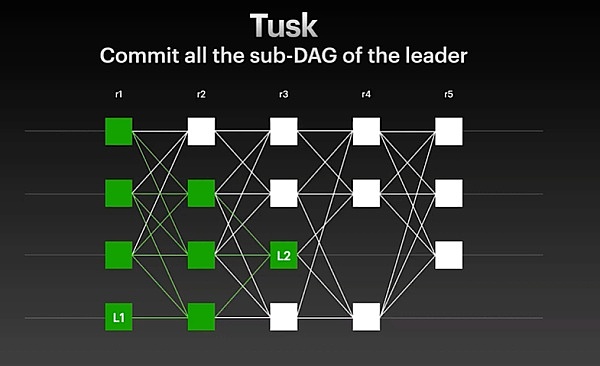 Tusk是一个零信息异步共识协议,它只要看DAG模型就能得到所有交易顺序,并完成排序共识。