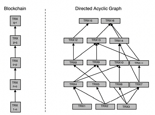 传统区块链网络是线性的,每个块都要等上一个处理完毕后再进行下一个验证,且所有节点要保存所有账簿。而DAG不以区块为单位,交易各自为链上的点,由不同的节点储存和认证,没有领导,因此各自处理各自的交易,实现平行处理消息。