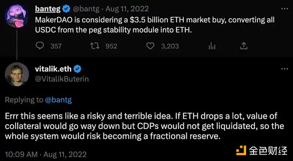 DAI 有可能放弃和 USD 锚定,导致短期内大量用户流失,尽管这或许利好 DAI 成为终极去中心化且拥有稳定购买力(而不是美元汇率)的货币(社区并没有达成一致,是创始人 Rune 单方面的想法,按计划会在 2025 年前后成为讨论焦点),但 V 神曾对此表示担忧。