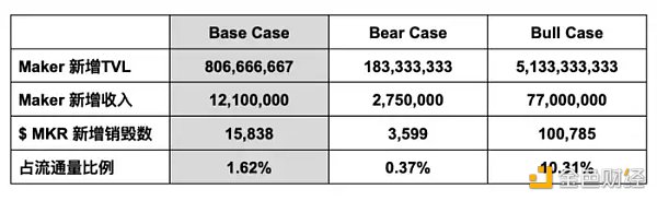 如果按照平均 1.5% 的稳定费(年化铸造利息)和 $MKR 现价$764 来计算三种情况,对应的 Maker 新增 TVL $MKR 年通缩率将有如下预期,基准情况下可能给 Maker 带来 8 亿美元新增 TVL、1,200 万年收入,以及 1.6% 的年通缩率,是目前的四倍,而悲观情况下可能仅带来不到 2 亿 TVL 增长和 275 万年收,但即便如此也可以对应年 0.37% 的 $MKR 销毁: