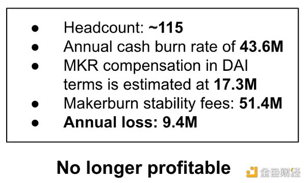 在 2022 年 6 月,MakerDAO 联合创始人 Rune Christensen 公布的数据显示:MakerDAO 稳定费年度收入约为 5,140 万美元,但是要维护这个协议所需消耗为 6,090 万美元,其中包括 4,360 万美元的现金流以及以 $DAI 计价的 1,730 美元的 $MKR,成本支出已经超过协议收入,致使协议亏损约 940 万美元。
