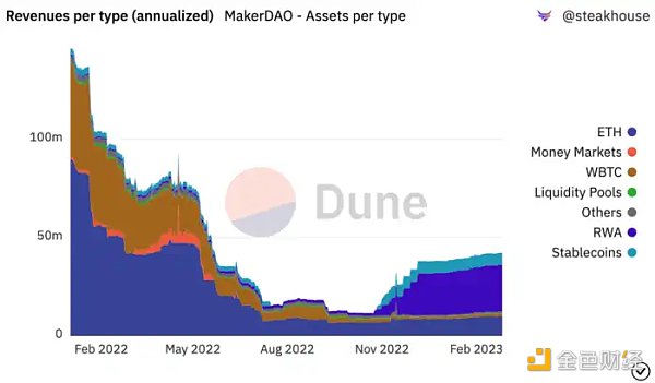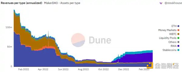 从上图可以看到:1)ETH Vault 在 2022 年 11 月之前一直是 MakerDAO 的重要获利来源;2)2022 年 11 月之后,RWA(现实资产)Vault 成为 MakerDAO 协议收入最大来源。