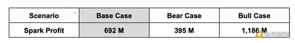 Spark 官方团队同样假定了中性、悲观、乐观三种情形下 Spark 协议的收入表现,读者可以对比参考,在 Bull Case 下预期高于我们,意味着他们乐观估计或有 50 亿 TVL,而中性、悲观的预期我们觉得相对合理: